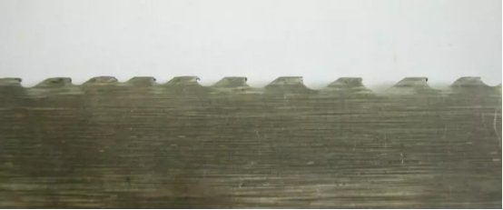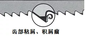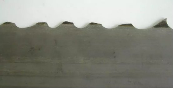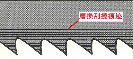 c)進給過低導致帶鋸條齒尖發生摩擦磨損。這種現象多發生在鋸切有加工硬化的材料中,比如不銹鋼和工具鋼。鋸切不銹鋼時要盡量選取帶大的正前角的鋸條。